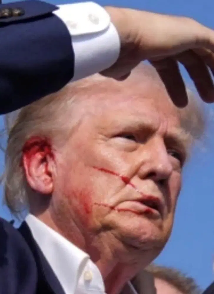 وبينما تم إجلاؤه، رفع أحد الضباط ذراعه فوق رأس ترامب لحمايته من المزيد من الطلقات المحتملة، في حين رفع الرئيس قبضته وسط هتاف أنصاره، إلا أن الدم قد ملأ وجهه.