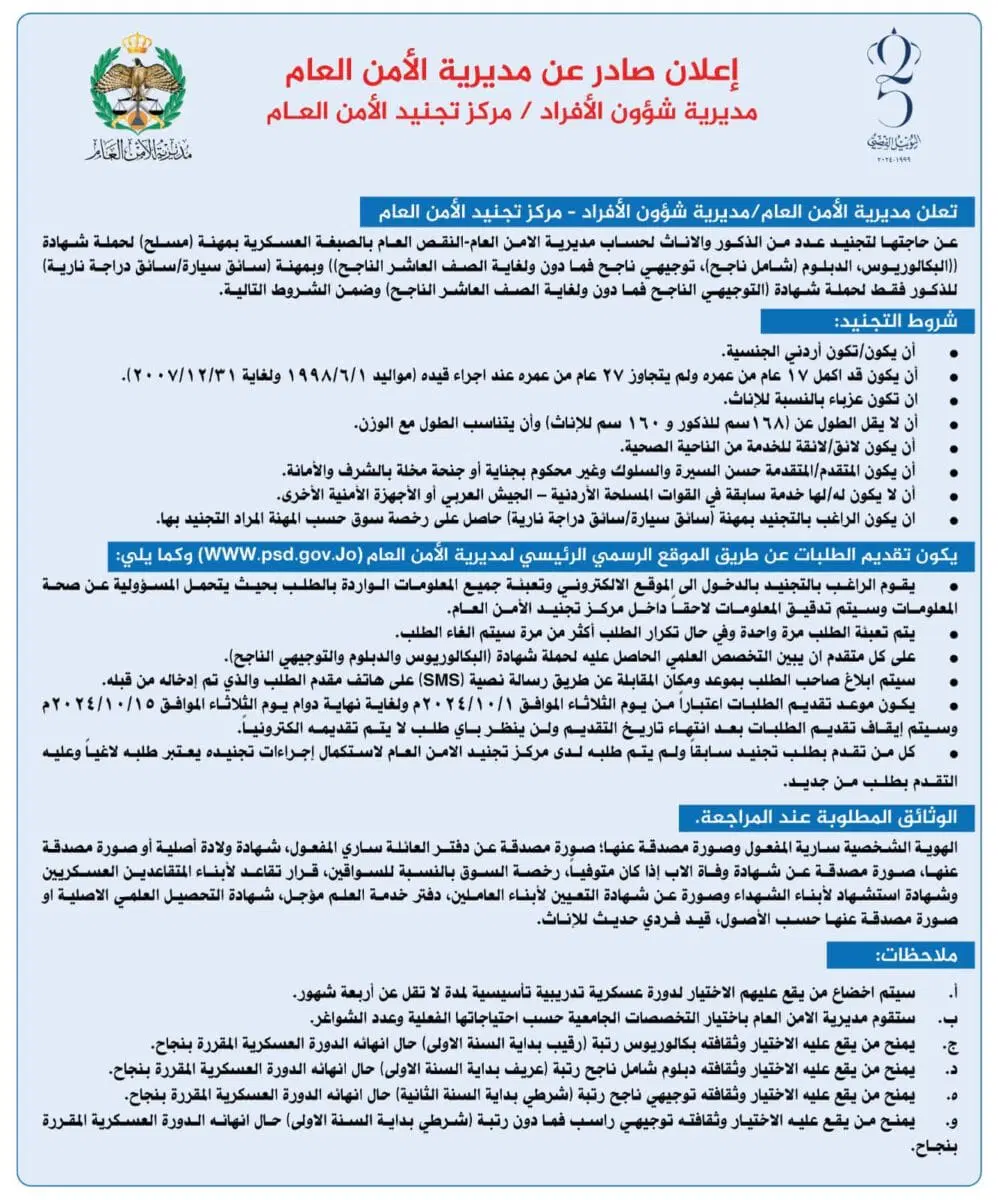 أعلنت مديرية الأمن العام / مديرية شؤون الأفراد – مركز تجنيد الأمن العام- عن حاجتها لتجنيد عدد من الذكور والإناث لحساب مديرية الأمن العام – النقص العام – بالصبغة العسكرية بمهنة(مسلح) لحملة شهادة البكالوريوس، الدبلوم (شامل ناجح)، توجيهي ناجح فما دون ولغاية الصف العاشر الناجح، وبمهنة (سائق سيارة /سائق دراجة نارية) للذكور فقط لحملة شهادة التوجيهي الناجح فما دون ولغاية الصف العاشر الناجح.