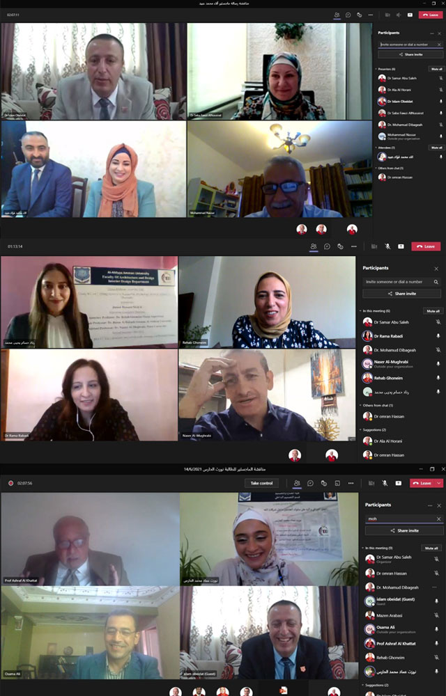· و رسالة الماجستير للطالبة نوزت عماد الحارس بعنوان: الحيز الفراغي وأثره على سلوك العاملين داخل شركات التصميم الداخلي. Spatial Design and its Effect of Workers’ Behavior in Interior Design Companies حيث تكونت لجنة المناقشة من محكمين داخليين وخارجيين وهم: 1. د. إسلام عبيدات / جامعة عمان الاهلية / مشرفاً ورئيساً للجنة 2. أ.د. اشرف الخطاط / جامعة عمان الاهلية / ممتحنا داخليا 3. د. أسامة حسن إسماعيل / جامعة الزرقاء / ممتحنا خارجيا. .