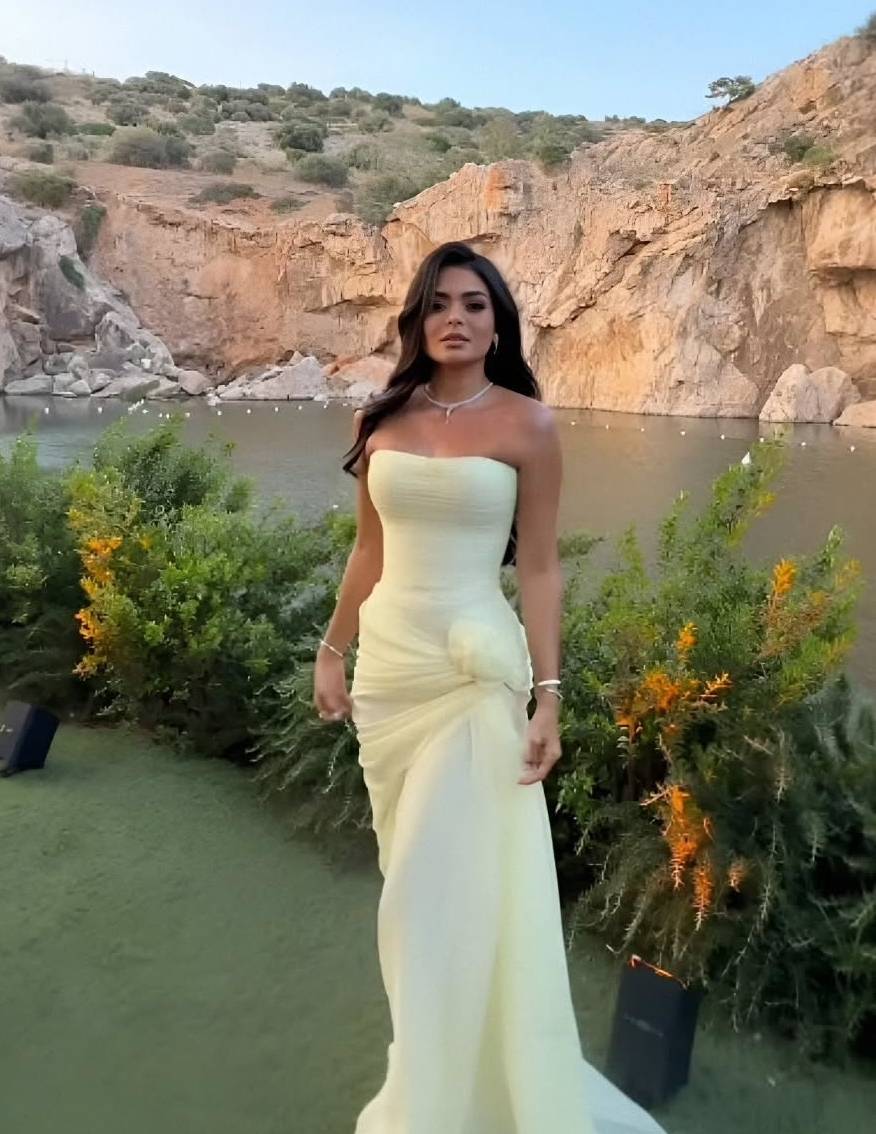 أسماء جلال اختارت الأصفر الباستيلي ليكون لونها في هذا اليوم المميز، بفستان سترابلس من Kojak Studio. التصميم جاء ضيّقاً يبرز الخصر، مع تفاصيل مزمومة تضيف حركة وجاذبية، بينما أضفت الوردة الكبيرة على جانب الخصر لمسة فنية. شعر “ويفي” ناعم ومكياج برونزي أكمل إطلالتها المشرقة.