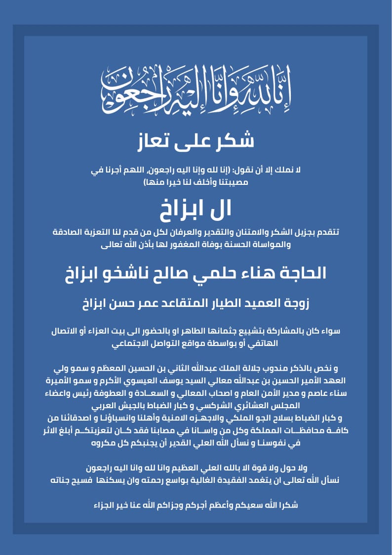 عمان – يتقدم آل ابزاخ بجزيل الشكر والأمتنان والتقدير والعرفان لكل من قدم التعزية الصادقة والمواساة الحسنة بوفاة المغفور لها بإذن الله تعالى الحاجة ” هناء حلمي صالح ناشخو ابزاخ ” , زوجة العميد الطيار المتقاعد عمر حسن ابزاخ .