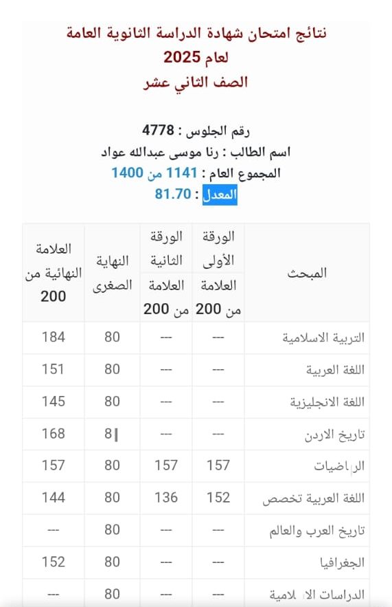 يتقدّم الأهل، والأخوال، والخالات، والأصدقاء بأسمى آيات التهاني والتبريكات من ابنتهم الغالية رنا موسى عوّاد، بمناسبة نجاحها في امتحان الثانوية العامة – الفرع الادبي، وحصولها على معدل 82%.