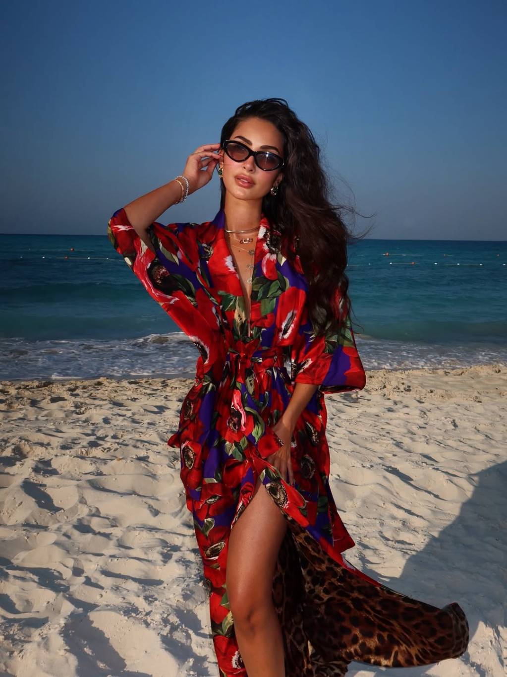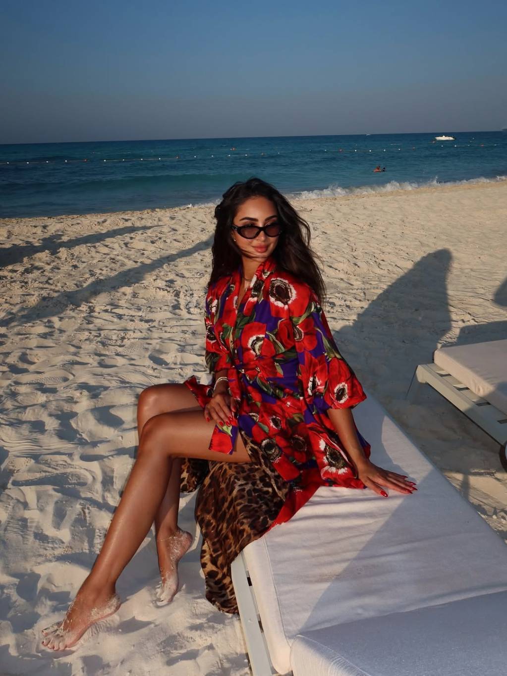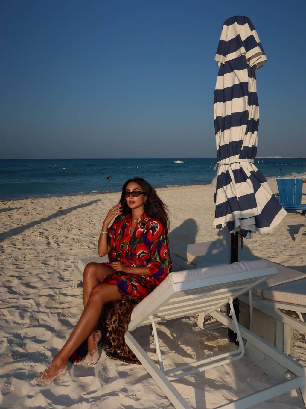 وفي إطلالة صيفية أخرى، اختارت الغندور رداء مطبّعاً بالورود بألوان الأحمر والأخضر والكحلي، فوق مايوه من قطعة واحدة، بتصميم أبرز خصرها النحيل ورشاقتها… ووصفت مظهرها في الصور بالقول: “شعر مالح وبشرة برونزية”.