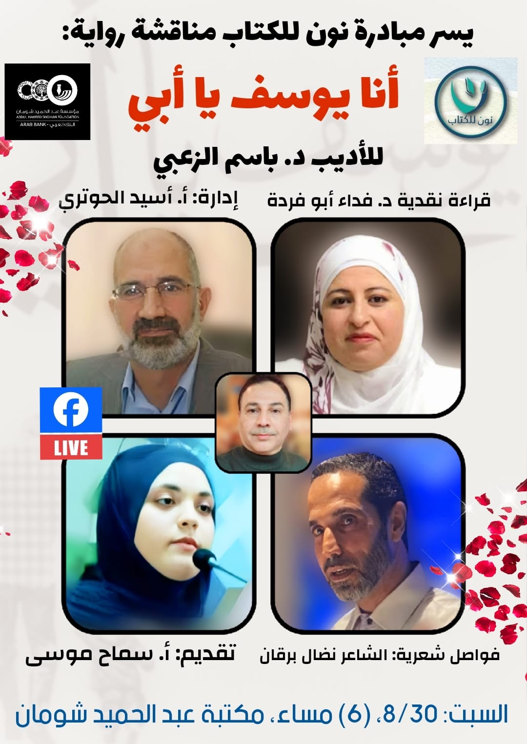 تستضيف مبادرة نون للكتاب يوم السبت المقبل الموافق 30 آب 2025 في مكتبة عبد الحميد شومان بجبل عمّان، الكاتب والأكاديمي الدكتور باسم إبراهيم الزعبي لمناقشة روايته «أنا يوسف يا أبي»، وذلك ضمن جلستها الثانية والثلاثين. وتتولى تقديم الفعالية الأستاذة سماح موسى، فيما يدير النقاش الناقد أسيد الحوتري، وتقدّم الدكتورة فداء أبو فردة قراءة نقدية للعمل، ويحيي الشاعر نضال برقان الفواصل الشعرية بباقة من قصائده.
