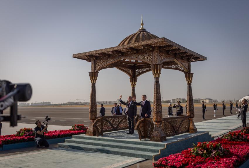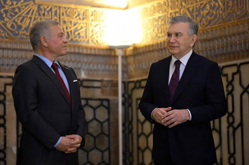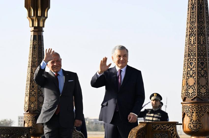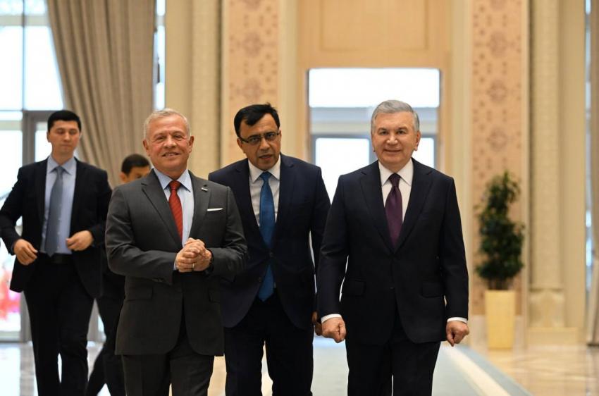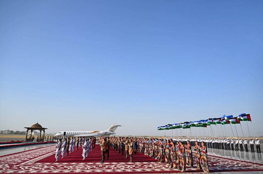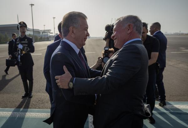 وكان في استقباله رئيس جمهورية أوزبكستان شوكت ميرضيائيف لدى وصول جلالته إلى المطار.