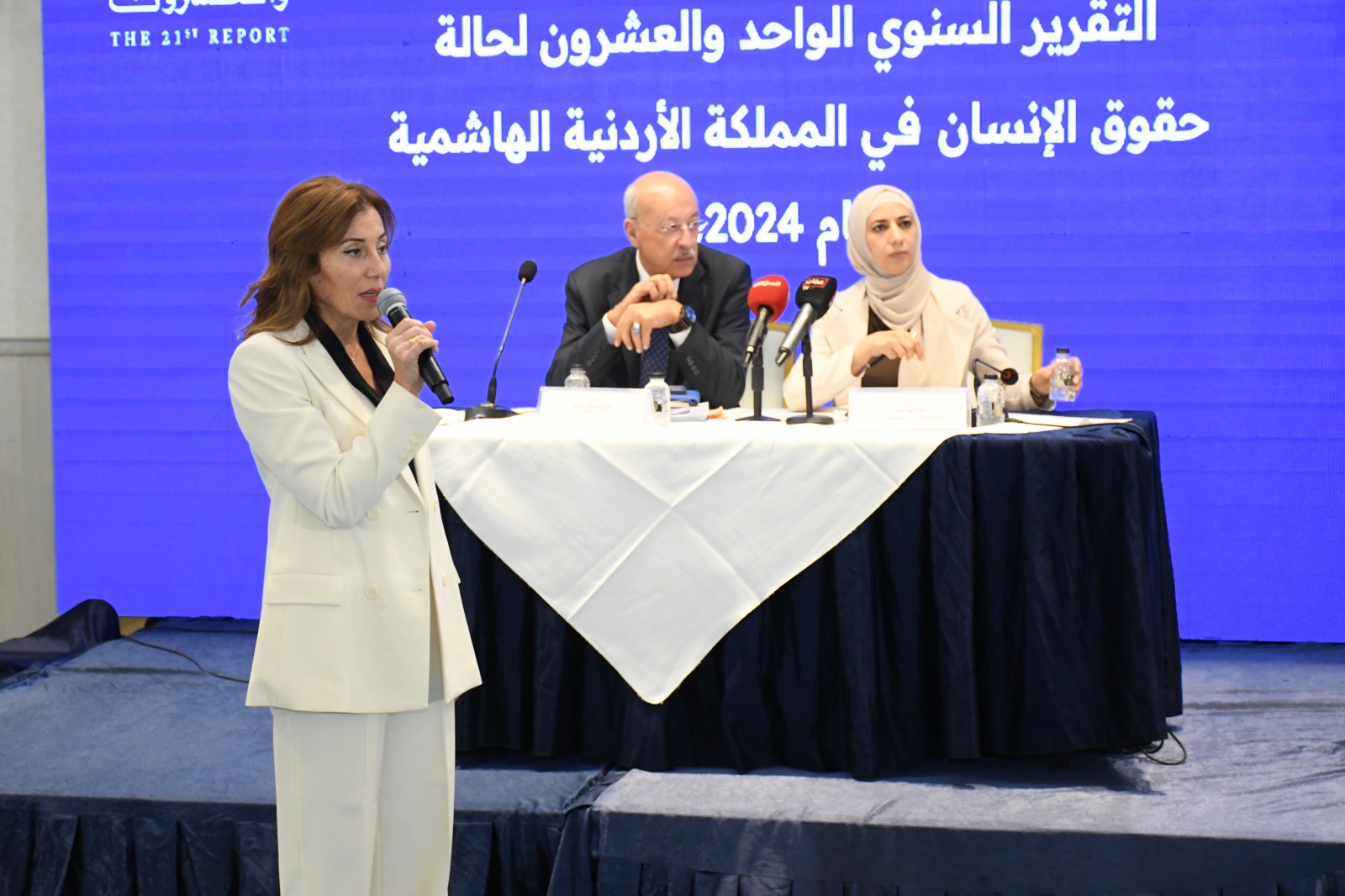 The launch was followed by a press conference, during which the Commissioner General and the Centre’s Commissioner for Protection, Dr. Nahla Al-Moumani, answered questions and inquiries from the media regarding the annual report.