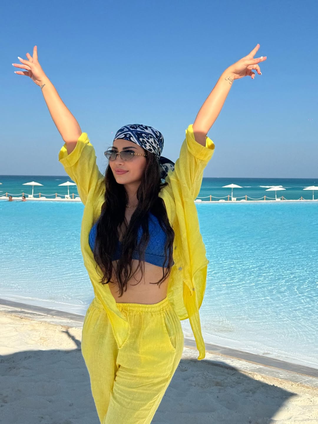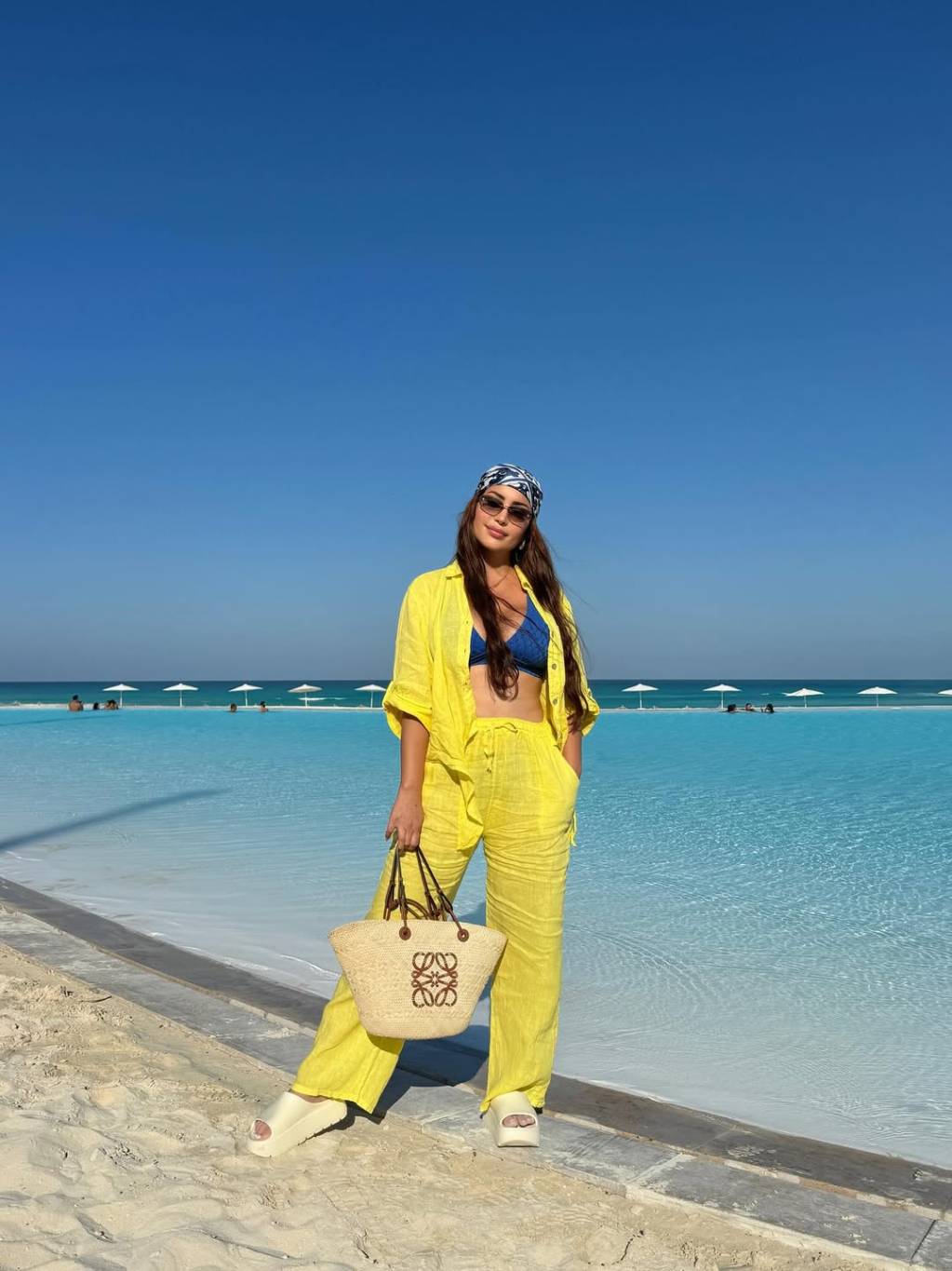 وتواصل نسرين إجازتها الصيفية في الساحل الشمالي، حيث أطلّت قبل أيام قليلة بمظهر جريء على شاطئ البحر، بمايوه كحلي اللون مؤلف من قطعتين، تحت مجموعة من اللينين الأصفر، هي سروال فضفاض وقميص فكّت أزراره في بعض الصور التي نشرتها، وخلعته في لقطات أخرى. وأكملت طافش إطلالتها بشبشب كريمي اللون، واعتمدت في الأكسسوارات على “بوندانا” باللونين الأبيض والكحلي تناسقت مع ملابس البحر، بالإضافة إلى نظّارات شمسية وحقيبة يد مصنوعة من القش.