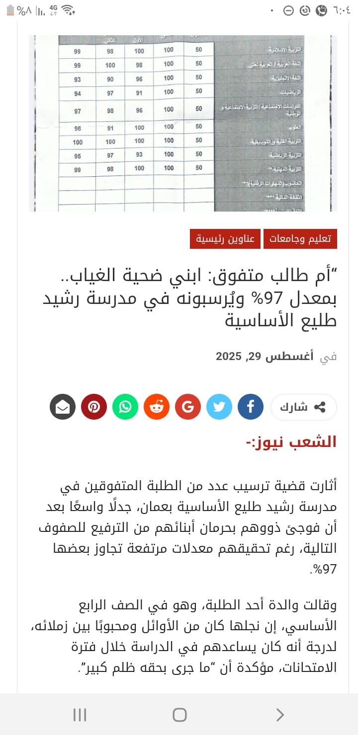 وزير التربية يحقق في قضية طالب رسب رغم حصوله على معدل 97% بعد إثارتها من قبل الشعب نيوز”