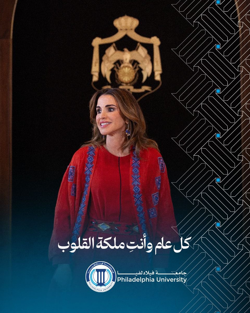 أسرة جامعة فيلادلفيا، ممثلةً بمجلس أمنائها، ومجلس إدارتها، ورئيسها الأستاذ الدكتور عبدالله الجراح، وطلبة الجامعة، تهنئ صاحبة الجلالة الملكة رانيا العبدالله المعظمة بمناسبة عيد ميلادها الميمون، سائلين المولى عز وجل أن يحفظ جلالتها ويمدّها بموفور الصحة والعافية، وأن يديم مسيرتها الزاخرة بالعطاء الإنساني والوطني، في ظل حضرة صاحب الجلالة الملك عبدالله الثاني ابن الحسين المعظم حفظه الله ورعاه