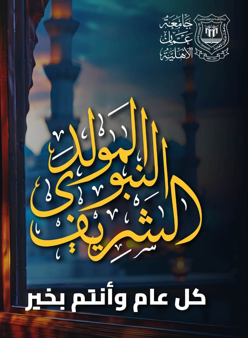 أسرة جامعة عمان الأهلية ممثلة برئيس مجلس الأمناء دولة الأستاذ عبدالكريم الكباريتي وأعضاء المجلس ورئيس هيئة المديرين الدكتور ماهر الحوراني ونائبه الاستاذ عمر الحوراني وأعضاء الهيئة ورئيس الجامعة الأستاذ الدكتور ساري حمدان وأعضاء الهيئتين التدريسية والإدارية وطلبة الجامعة، يتقدمون بمناسبة ذكرى المولد النبوي الشريف بالتهنئة والتبريك من قيادتنا الهاشمية وعلى رأسها جلالة الملك عبدالله الثاني ابن الحسين المعظم ومن سمو ولي العهد الأمير الحسين ابن عبدالله الثاني، ومن الشعب الاردني ومن أمتنا العربية والأمة الاسلامية ، داعين الله عز وجل ان يعيد هذه الذكرى العطرة المباركة عليهم جميعا بالخير والبركات