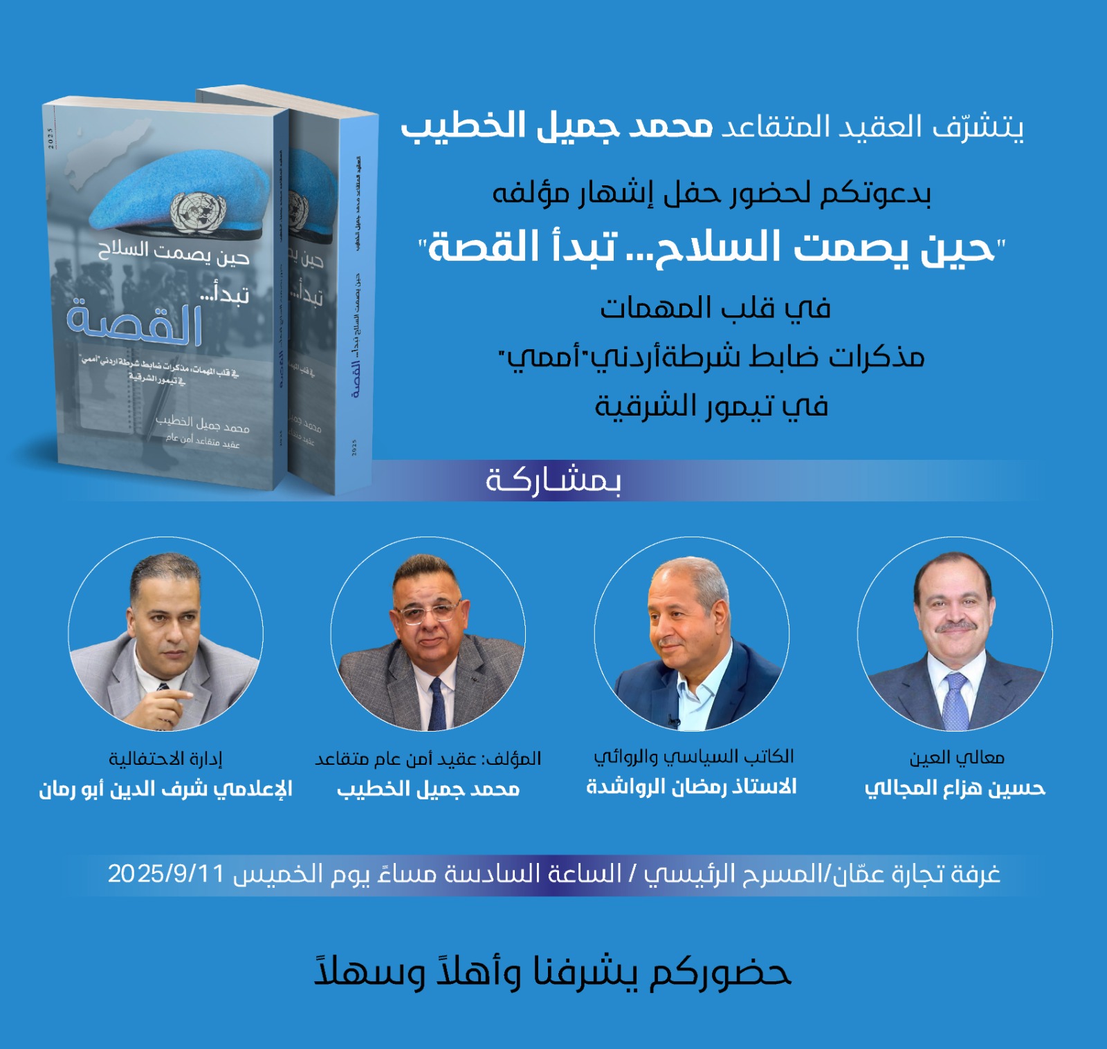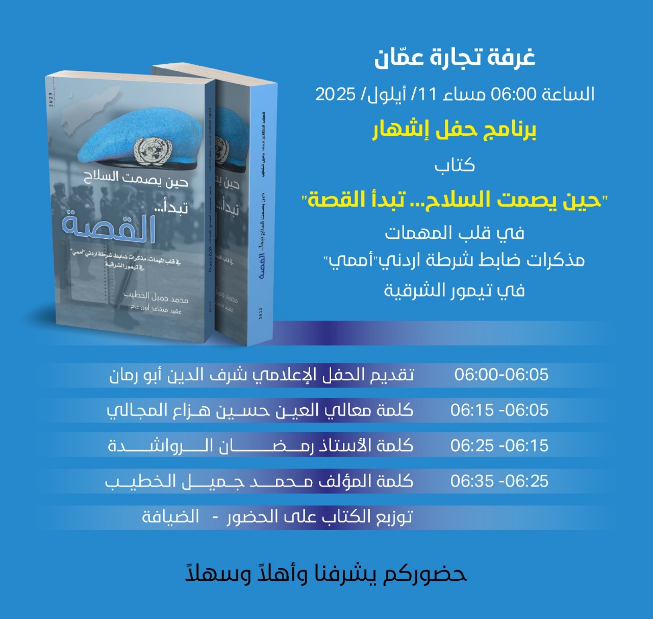 تستعد غرفة تجارة عمان لاستضافة حفل إشهار كتاب “حين يصمت السلاح… تبدأ القصة” للعقيد المتقاعد محمد جميل الخطيب، وذلك عند الساعة السادسة من مساء يوم الخميس 11 أيلول 2025، على المسرح الرئيسي في مبنى الغرفة.