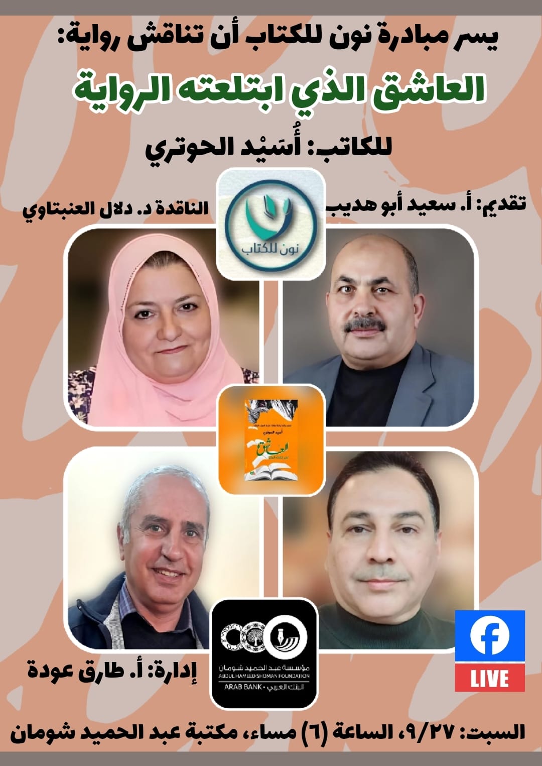 تعقد مبادرة نون للكتاب يوم السبت الموافق السابع والعشرين من أيلول/سبتمبر 2025 جلستها الثالثة والثلاثين في مكتبة عبد الحميد شومان بجبل عمّان، حيث تستضيف الكاتب أسيد الحوتري لمناقشة روايته “العاشق الذي ابتلعته الرواية”.