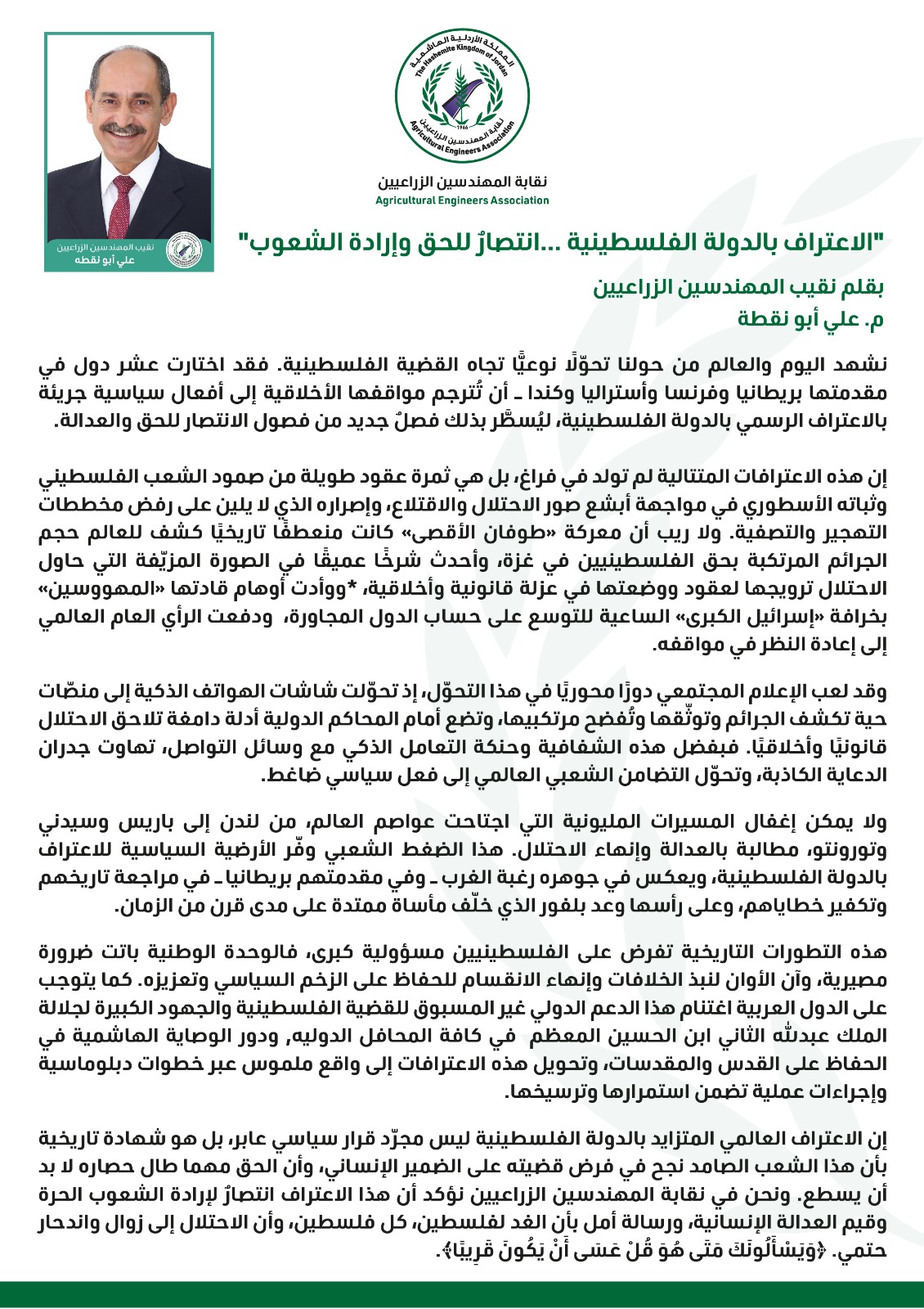 إن الاعتراف العالمي المتزايد بالدولة الفلسطينية ليس مجرّد قرار سياسي عابر، بل هو شهادة تاريخية بأن هذا الشعب الصامد نجح في فرض قضيته على الضمير الإنساني، وأن الحق مهما طال حصاره لا بد أن يسطع. ونحن في نقابة المهندسين الزراعيين نؤكد أن هذا الاعتراف انتصارٌ لإرادة الشعوب الحرة وقيم العدالة الإنسانية، ورسالة أمل بأن الغد لفلسطين، كل فلسطين، وأن الاحتلال إلى زوال واندحار حتمي. ﴿وَيَسْأَلُونَكَ مَتَى هُوَ قُلْ عَسَى أَنْ يَكُونَ قَرِيبًا﴾.
