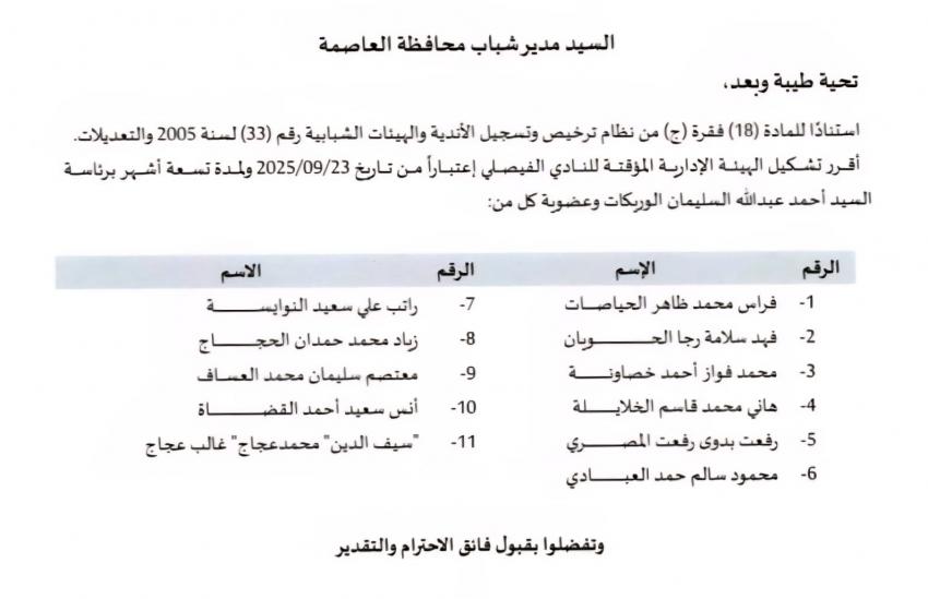 وزارة الشباب تشكل اللجنة المؤقتة للنادي الفيصلي (أسماء)