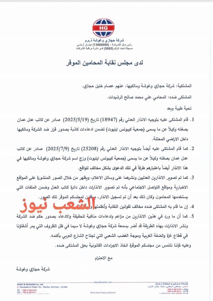 رفعت شركة حجازي وغوشة، ويمثلها مالكوها عنهم عصام خليل حجازي، دعوى لدى مجلس نقابة المحامين ضد أحد المحامين، بعد قيامه بتوجيه إنذار عدلي بصفته وكيلاً عن ما يسمى “جمعية كيبوتس إيليوت”، تضمن زج اسم الشركة بشكل مخالف للواقع، وفق ما ورد في نص الدعوى.