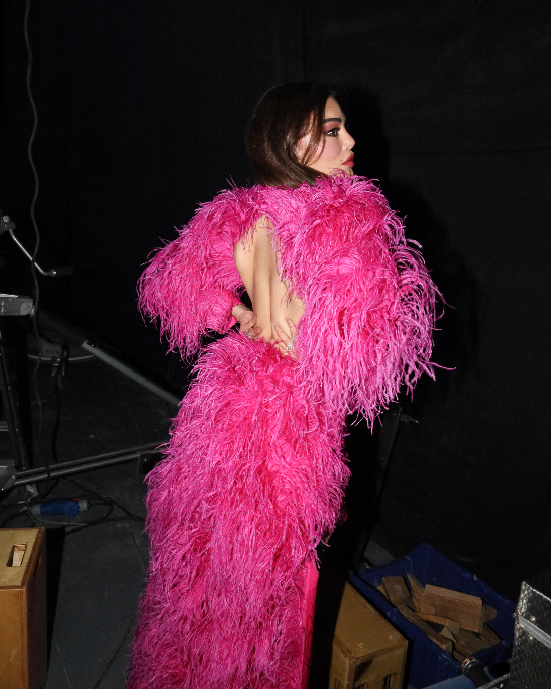 والتصميم الثاني عبارة عن بليزر من قماش التفتا المموج بلون الفوشيا الوردي، مزين بريش خالٍ من القسوة على الأكمام وعباءة خلفية جذابة، يعكس القوة والأنوثة والحرفية الراقية. تتناغم درجات اللون الوردي النابضة بالحياة وتفاصيل الريش بشكل مثالي مع جاذبية هيفاء الطبيعية، مما يعزز حضورها على الشاشة