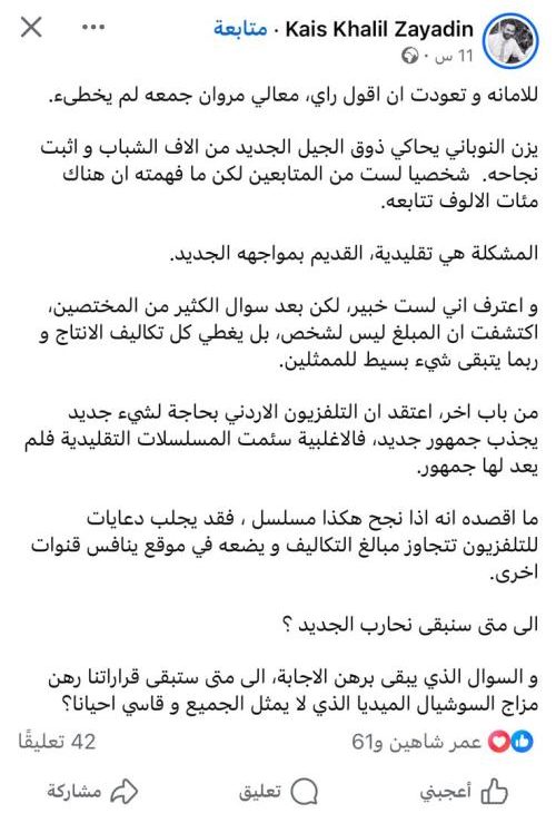 وأشار زيادين إلى أن التلفزيون الأردني في أمسّ الحاجة إلى محتوى جديد ومبتكر، قادر على استعادة جمهور هجَر الشاشة الرسمية لصالح المنصات الأخرى، قائلاً: “نجاح هذا النوع من الأعمال قد يفتح الباب أمام إيرادات إعلانية تتجاوز قيمة التكاليف وتعيد المنافسة للتلفزيون.”
