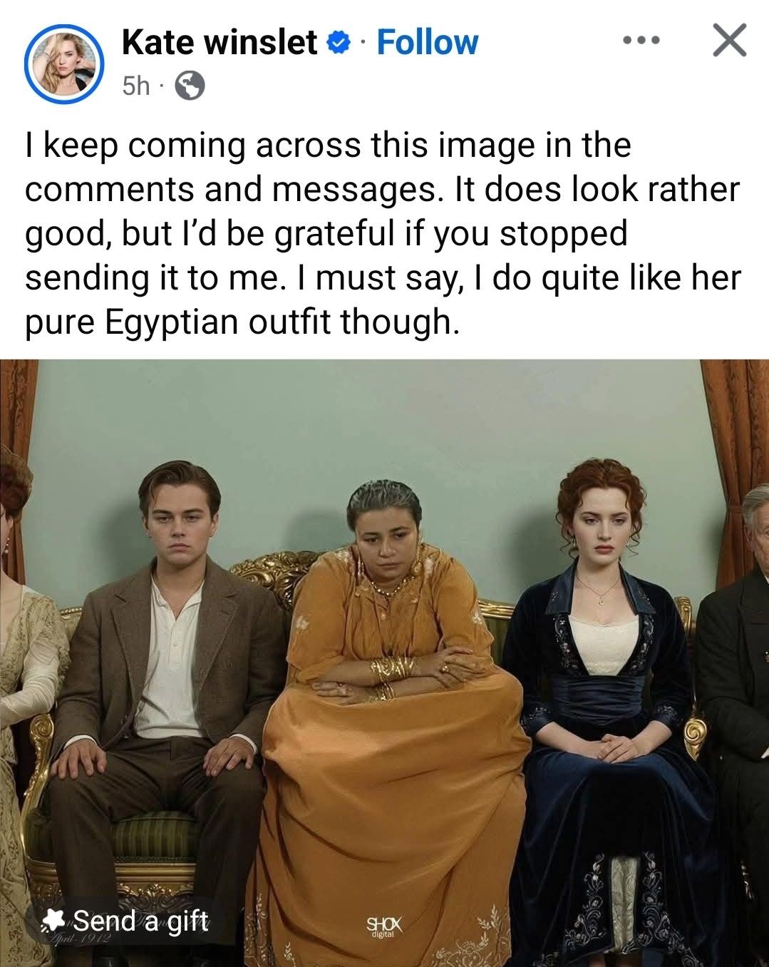 ونشرت كيت وينسليت عبر حسابها الخاص في “فيسبوك” الصورة، وعلّقت عليها باستغاثة للجمهور المصري بعدم إرسالها إليها مرة أخرى، وذلك بعد وضع الصورة مراراً في أي منشور لها خلال الفترة الماضية.