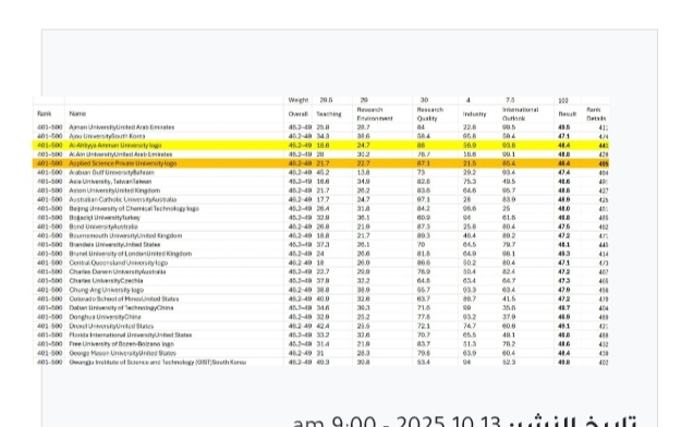 منعاً للتشويش والتضارب بنشرالأخبار حول نتائج تصنيف التايمز 2026 محلياً، تؤكد جامعة عمان الأهلية فوزها بالمركز الأول محليا ً، حيث جاءت في المرتبة 441 وبفارق 54 مرتبة عمن حل في المركز الثاني محلياً ضمن الفئة 401 – 500 عالمياً وفق الجدول المرفق الذي يوضح مجموع النقاط والمرتبة لكل جامعة ” بالتفصيل “.