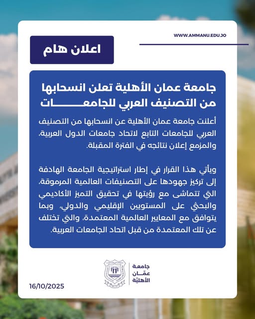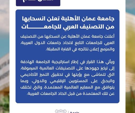 أعلنت جامعة عمان الأهلية عن انسحابها من التصنيف العربي للجامعات التابع لاتحاد جامعات الدول العربية، والمزمع إعلان نتائجه في الفترة المقبلة.