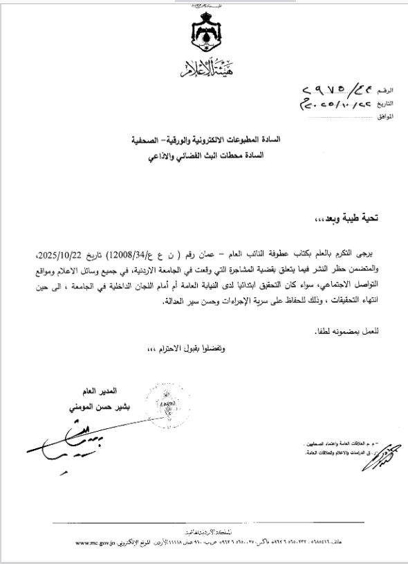 وقال العبداللات، اليوم الأربعاء، إنَّ حظر النشر يشمل جميع وسائل الإعلام ومنصَّات التواصل الاجتماعي، في كل ما يتعلق بهذه القضية سواء كان هذا التحقيق ابتدائيا لدى النيابة العامة ام أمام اللجان الداخلية في الجامعة وحتى انتهاء التحقيقات، ويعمل بهذا القرار من تاريخ صدوره وتبليغه للجهات ذات العلاقة للعمل به.