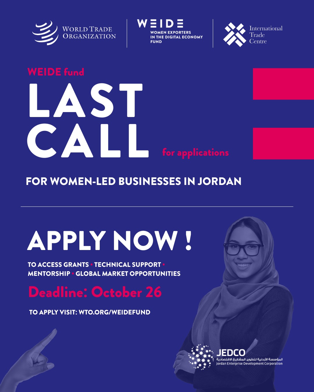 عمّان –دعت المؤسسة الأردنية لتطوير المشاريع الاقتصادية (جيدكو) رائدات الأعمال والمشاريع الصغيرة والمتوسطة التي تمتلكها النساء في مختلف محافظات المملكة إلى المسارعة في تقديم طلباتهن للاستفادة من صندوق النساء المصدّرات في الاقتصاد الرقمي (WEIDE Fund)، حيث تنتهي فترة استقبال الطلبات يوم الأحد الموافق 26 تشرين الأول 2025 عبر الموقع الإلكتروني الرسمي للصندوق: www.weidefund.org.