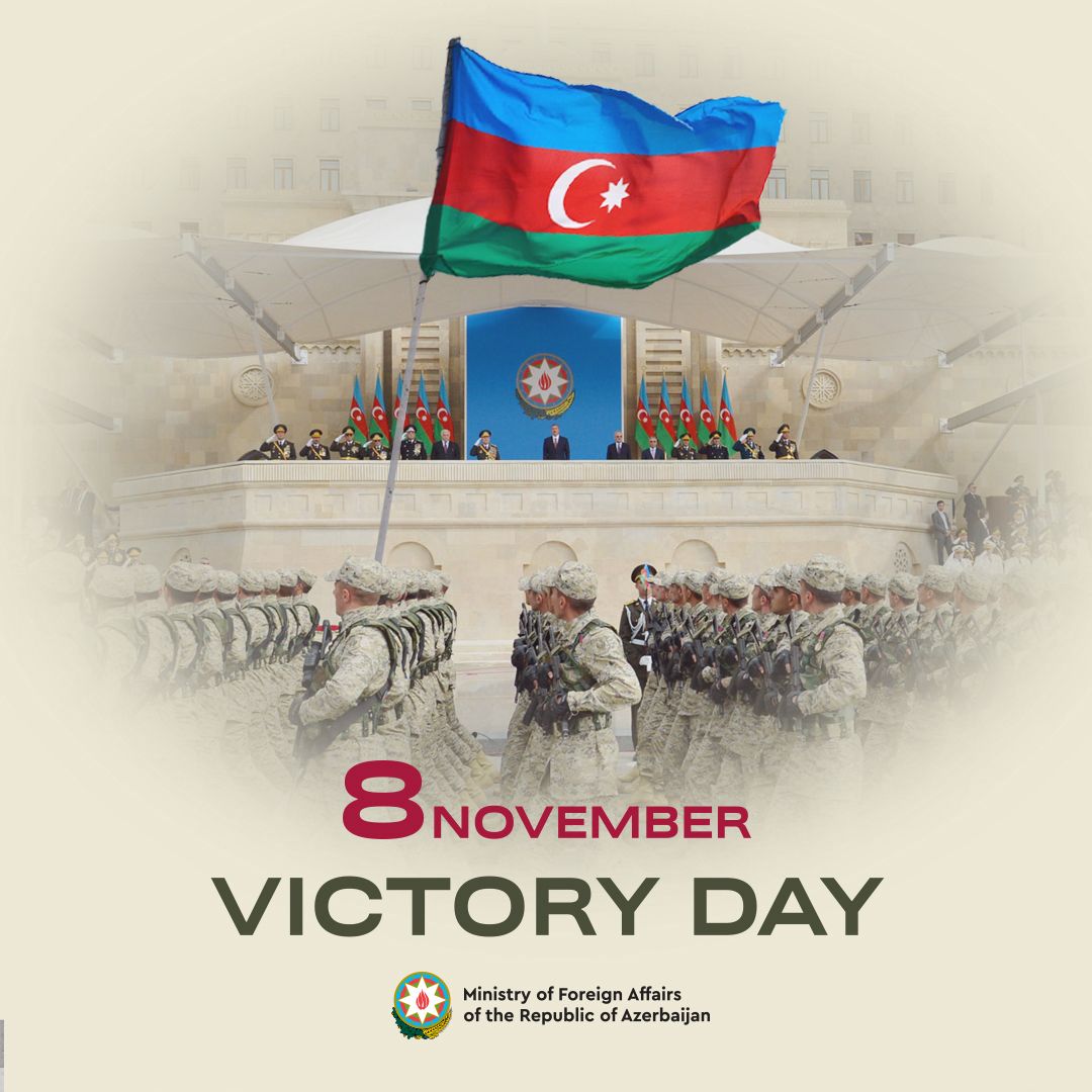 أعلن الرئيس الهام علييف رئيس جمهورية أذربيجان بأن يوم 8 نوفمبر “يوم النصر في الحرب الوطنية الأذربيجانية/2020، و دون هذا التاريخ من بدء دخول القوات الأذربيجانية إلى مدينة شوشة العاصمة الثقافية بعد تحريرها ، اليوم الذي استعادت فيه أذربيجان وحدة أراضيها وأذهلت الكثيرين بانتصارها العسكري ، و قد نفذت بنفسها قرارات مجلس الأمن الأربعة التي دعت فيها إلى انسحاب فوري وغير مشروط وكامل لجميع قوات الاحتلال من أراضي أذربيجان المعترف بها دوليًا ، والتي ظلت حبرا على ورق لمدة 30 عاما، ولمدة 44 يوما كان عشرة ملايين قلب في أذربيجان ينبضون كقلب واحد وبنفس التناغم للجنود الابطال المقاتلين من أجل تحرير قراباغ، و يتشوقون للنصر لإحياء الأرض التي دمرها العدو ، وقد تم تحرير اكثر من 300 منطقة سكنية في ميدان المعركة. وأُرغمت ارمينيا على توقيع وثيقة الاستسلام.