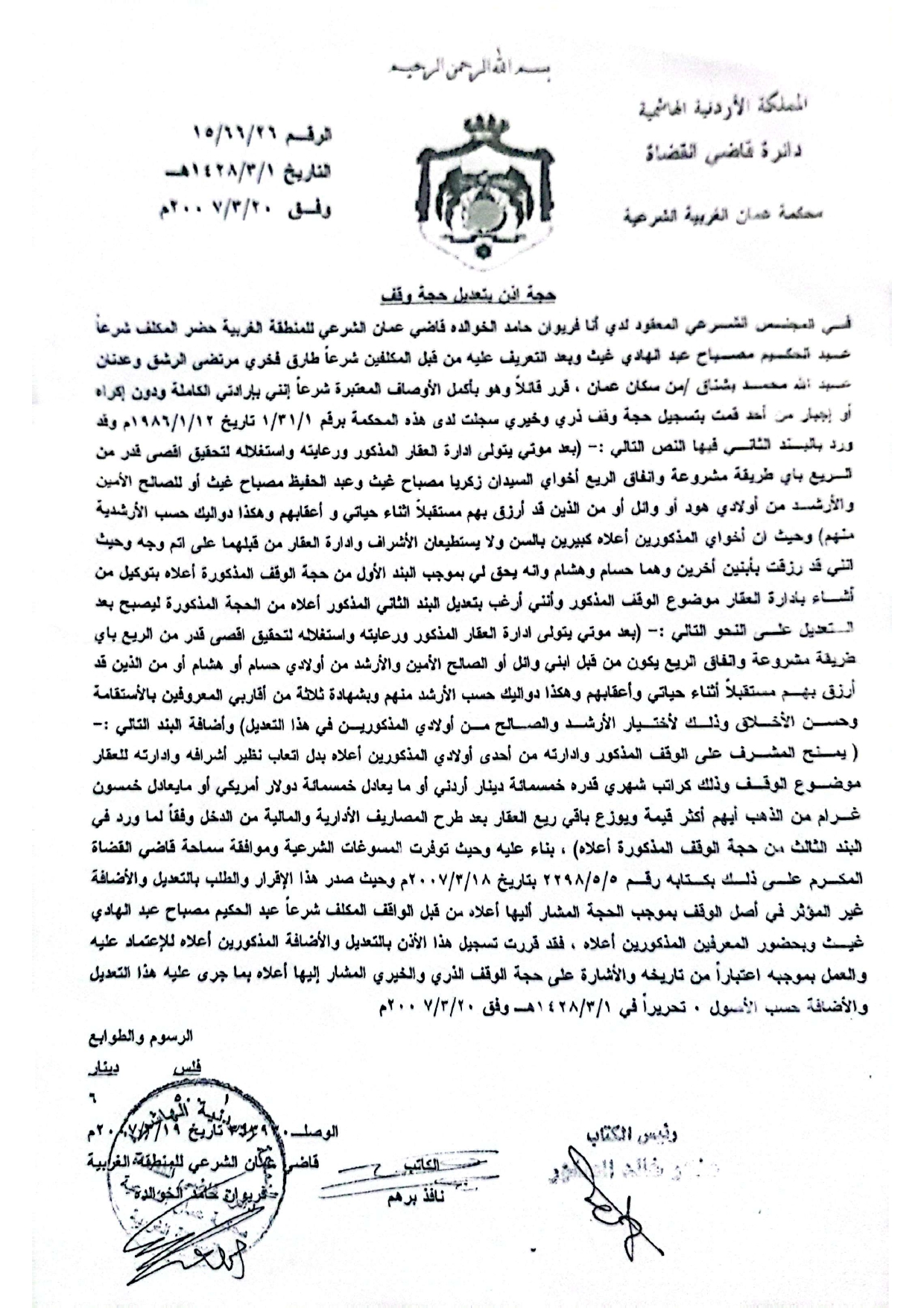 وبحسب أحكام الشريعة الإسلامية والقانون الأردني، فإن تعيين المتولي الشرعي يتم حصراً عبر المحكمة الشرعية بعد التحقق من توافر شروط الأمانة والكفاءة والقدرة على إدارة الوقف، واستكمال الوثائق المطلوبة التي تشمل وثيقة الوقف الأصلية، وهوية المرشح للتولية، وأي مستندات تثبت صلاحيته.