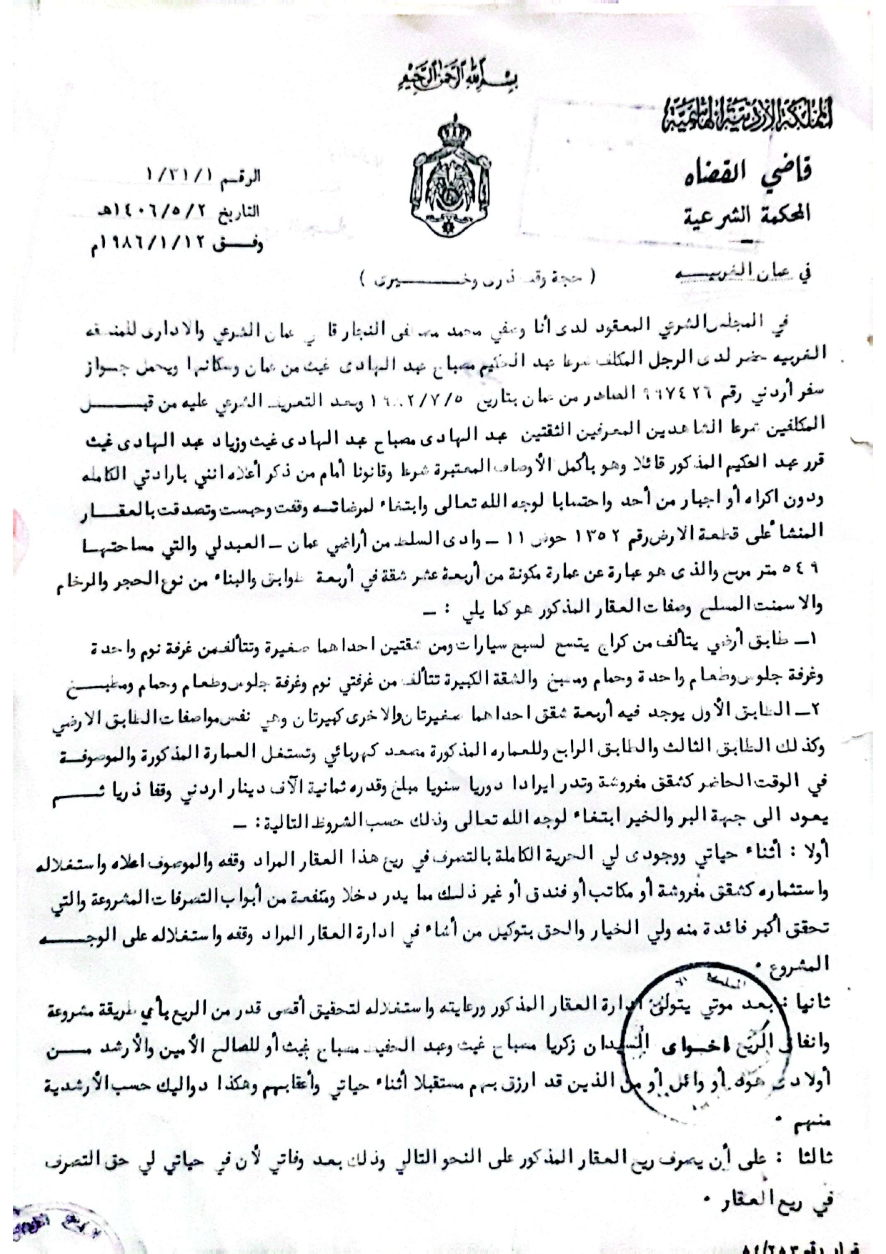 تعود جذور القضية إلى ما قبل عام 2008، حين سجّل المرحوم عبدالحكيم غيث عقارًا مكوّنًا من أربعة طوابق و14 شقة كوقفٍ ذري وخيري، بعد استكمال الإجراءات القانونية والشرعية كافة لدى وزارة الأوقاف ودائرة قاضي القضاة والمحكمة الشرعية.