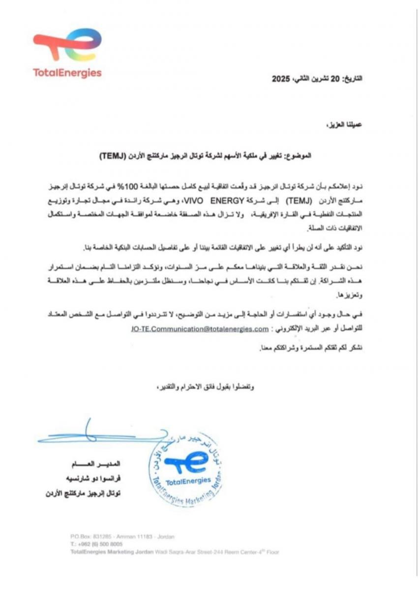 أعلنت شركة توتال انرجيز، بيع كامل حصتها البالغة 100% في شركة توتال إنرجيز ماركتنج الأردن (TEMJ) إلى شركة VIVO ENERGY.