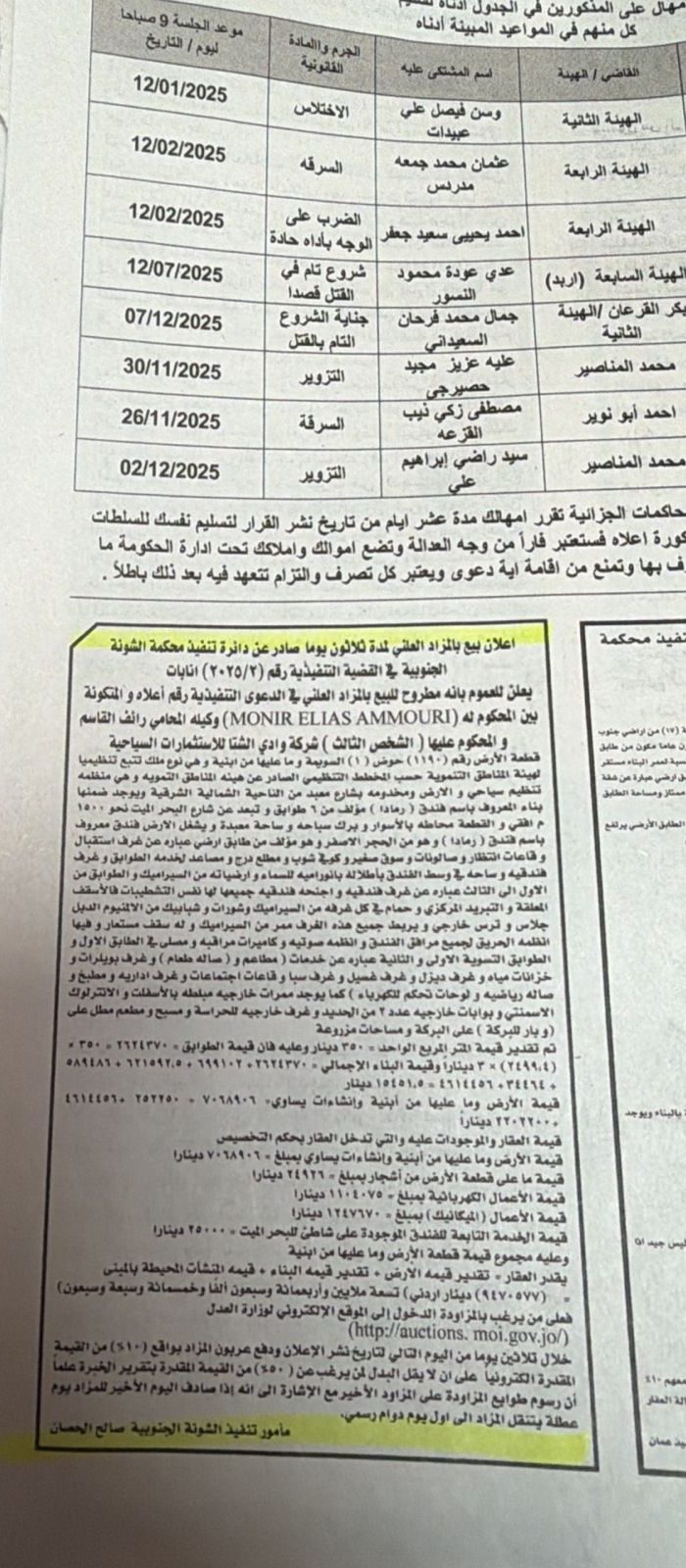 وبحسب الإعلان الصادر عن المحكمة، فقد جرى عرض العقار مع كامل مرافقه وأبنيته وخدماته التابعة، حيث قدّرت قيمته الإجمالية بنحو 9.4 مليون دينار أردني.