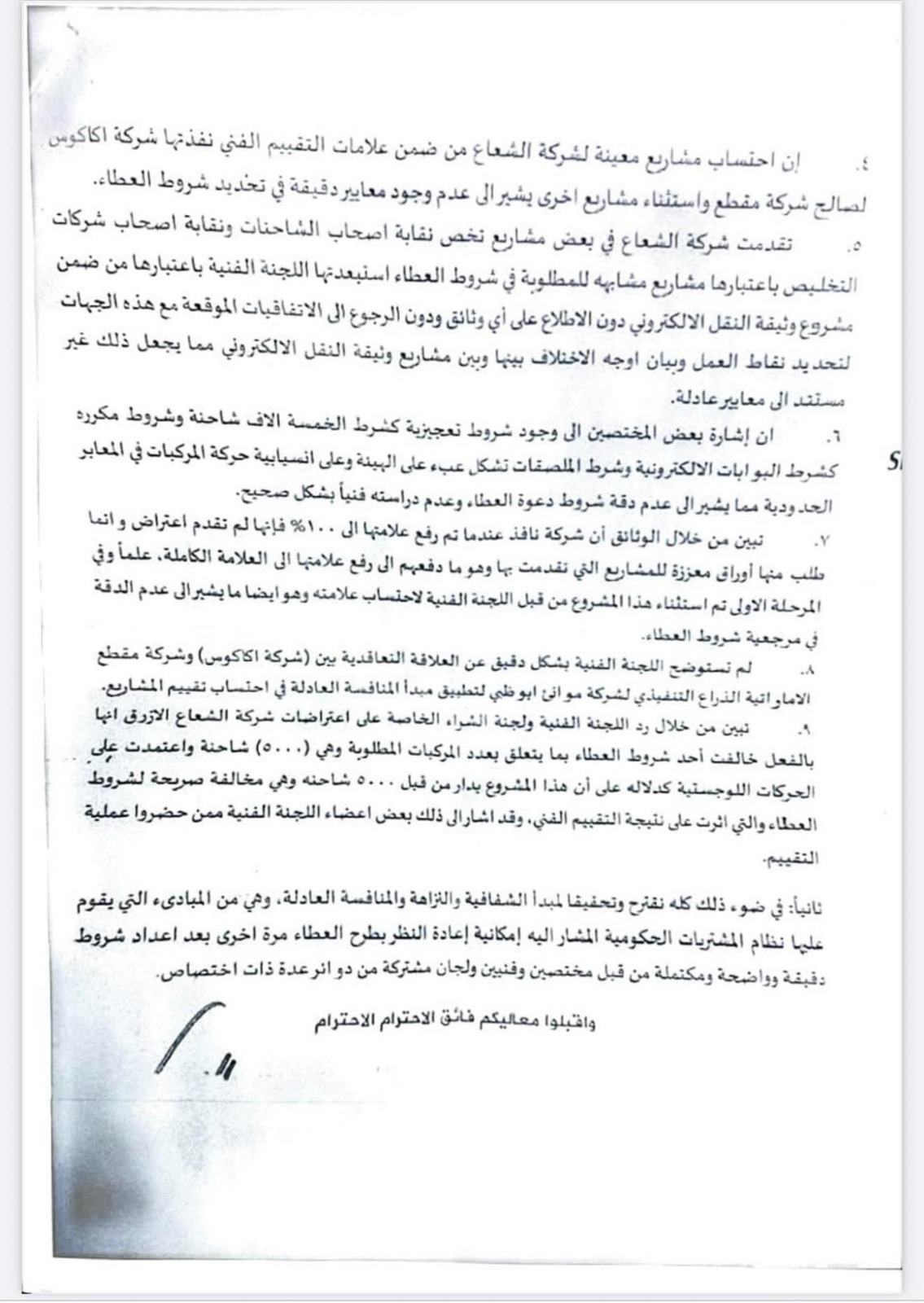راجياً من دولتكم التوجيه للجهات ذات العلاقة لاتخاذ المقتضى القانوني، مع فائق التقدير لجهودكم في ترسيخ مبادئ النزاهة والشفافية.