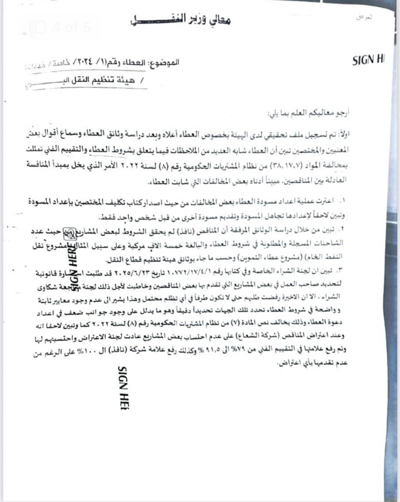 مستهجناً بذات الوقت أن وزارة النقل لا زالت ترفض الامتثال لقرار هيئة النزاهة و مكافحة الفساد بخصوص العطاء رقم ١ / ٢٤ التابع لهيئة النقل البري “والقاضي برفض مخرجات لجنة الشراء والتوصية باعادة طرح العطاء” في حين تستمر لجنة الشراء بإجراءات الإحالة بمخالفة صريحة للقانون!.