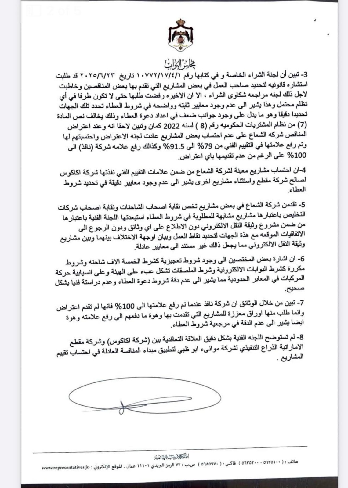 واشار في مداخلته ان الملف التحقيقي الذي اجرته هيئة مكافحة الفساد قد خلُص إلى أن العطاء قد شابه عدم الدقة و الاختلال في تطبيق معايير النزاهة و الشفافية و مخالفة المواد (38.17.7) من نظام المشتريات الحكومية رقم (😎 لسنة (2022) – الأمر الذي يخل بمبدأ المنافسة العادلة بين المتناقصين.