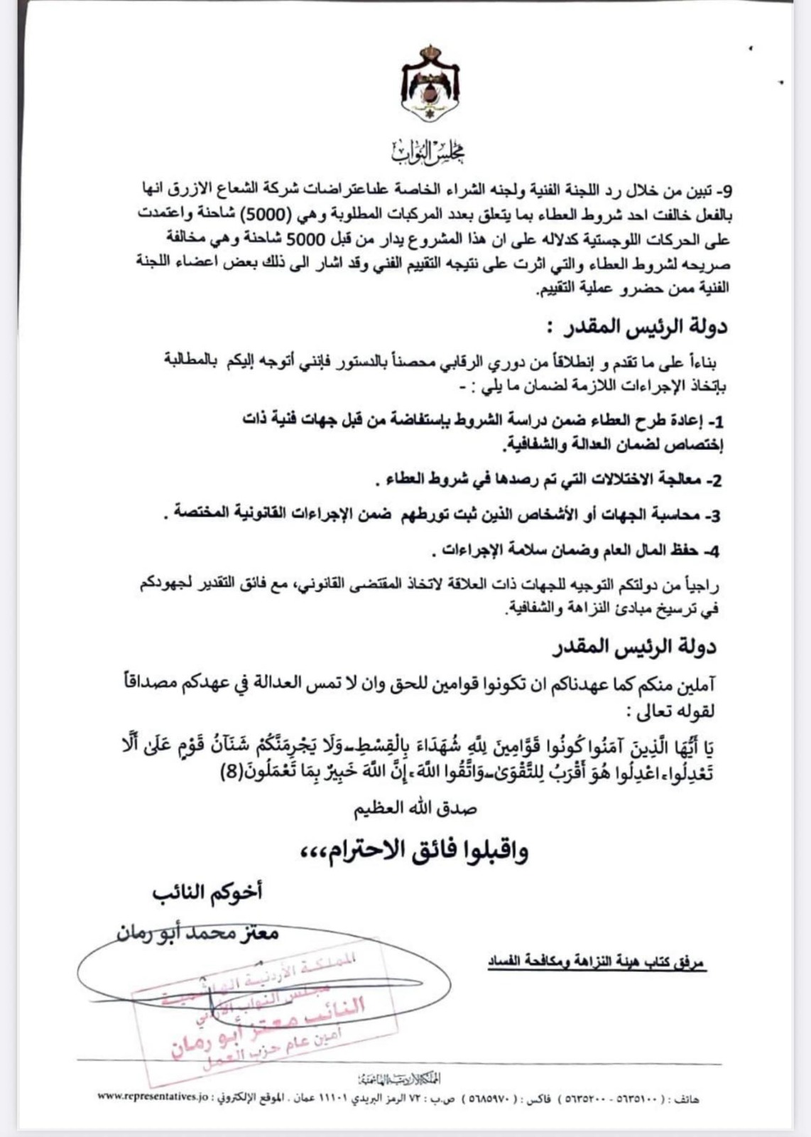 بالوثائق – أبو رمان يطالب الحكومة بمداخلته تحت القبة بالإمتثال إلى قرار لجنة التحقيق الصادرة عن هيئة مكافحة الفساد بخصوص عطاء هيئة النقل رقم 1/24 .
