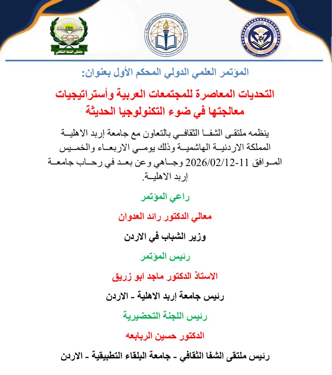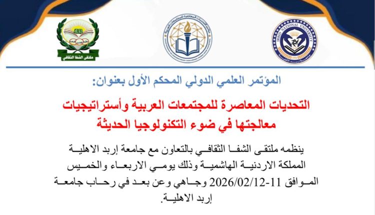 يسرّ ملتقى الشفا الثقافي بالتعاون مع جامعة إربد الأهلية – المملكة الأردنية الهاشمية دعوتكم للمشاركة في مؤتمر بعنوان: