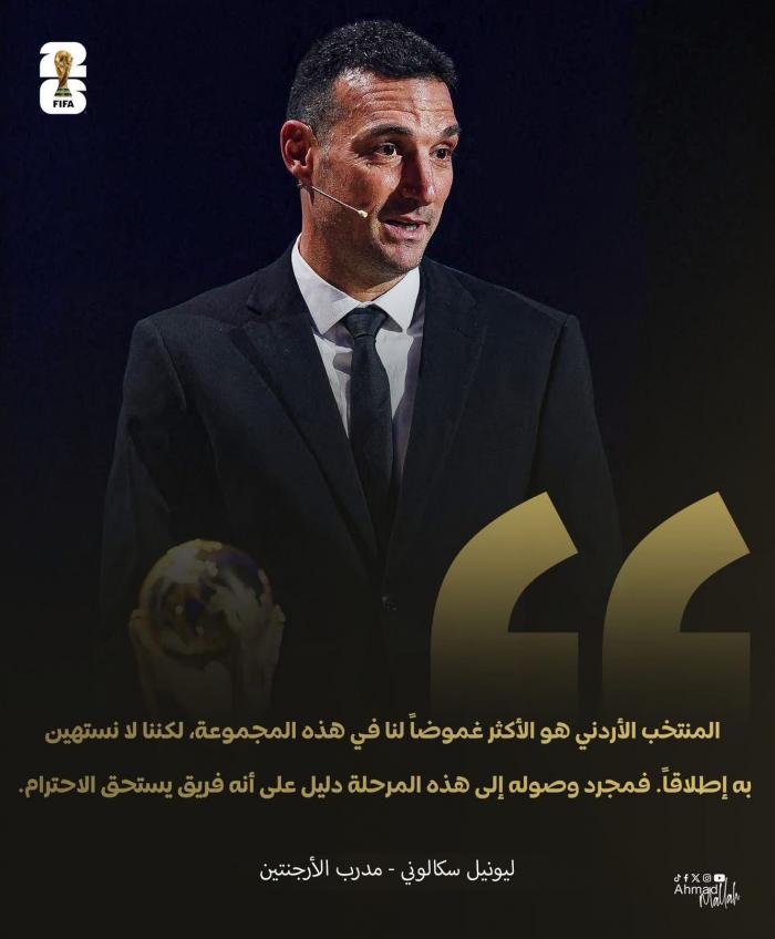 في تصريح قوي بعد سحب قرعة كأس العالم، وصف ليونيل سكالوني، مدرب المنتخب الأرجنتيني، المنتخب الأردني بأنه “الأكثر غموضًا في المجموعة”، مؤكداً أنه على الرغم من ذلك لا يستهين به أبداً.