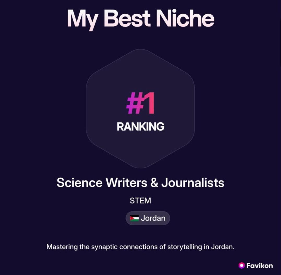 حققت الطالبة كندا المفلح من كلية الصيدلة في جامعة عمّان الأهلية إنجازًا لافتًا بعد حصولها على المرتبة الأولى في الأردن ضمن فئة Science Writers & Journalists – STEM بحسب تصنيف منصة Favikon العالمية المتخصصة بتقييم المؤثرين وصنّاع المحتوى في مجالات العلوم والتقنية. ويمثل هذا الإنجاز اعترافًا دوليًا بتميّز الطالبة في مجالات التواصل العلمي وصحافة العلوم، وبقدرتها على إنتاج محتوى علمي مبسّط وموثوق موجه للجمهور العام.