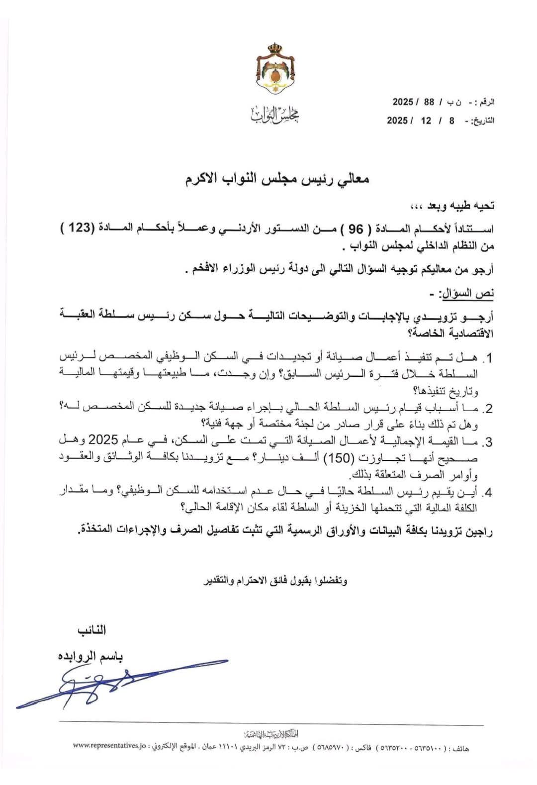 4 أسئلة نارية من الروابدة تهزّ ملف صيانة سكن رئيس سلطة العقبة..- وثيقة