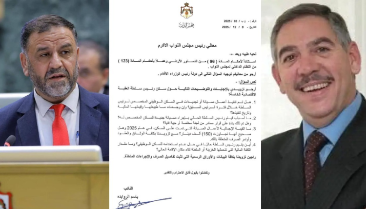 وشمل السؤال النيابي كذلك استفسارًا عن مكان إقامة رئيس السلطة الحالي في حال عدم استخدامه للسكن الوظيفي، وما تتحمله خزينة الدولة أو سلطة العقبة من نفقات لقاء مكان الإقامة البديل.