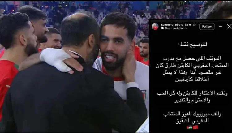 اعتذر اللاعب الأردني سليم عبيد بعد موقف عدم مصافحة لاعبي المنتخب الوطني لمدرب المنتخب المغربي طارق السكتيوي، الذي أثار الجدل على مواقع التواصل الاجتماعي.