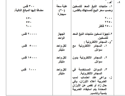كما أصبحت الضريبة الخاصة للسجائر الإلكتروينة على كل واحد ملليتر من السجائر الإلكترونية مع سائل (1500) فلس، والضريبة على السجائر الإلكترونية بدون سائل (10000 فلس) لكل جهاز، والضريبة الخاصة على السوائل المستخدمة في السجائر الإلكترونية (500 فلس) لكل واحد ملليتر.