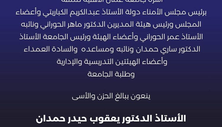 أسرة جامعة عمان الأهلية تنعي المرحوم أ.د. يعقوب حيدر حمدان