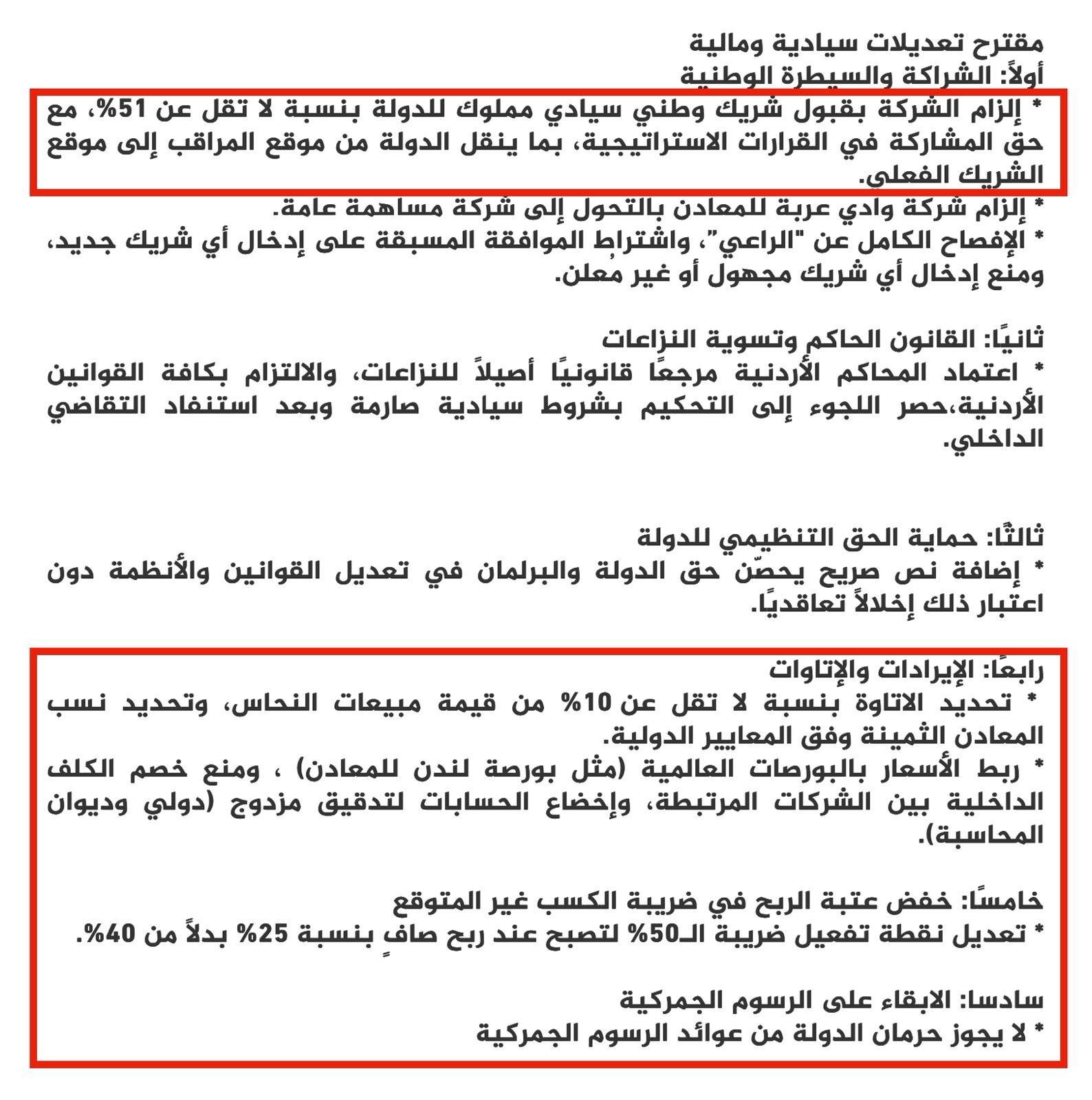 ثانياً تحديد الإتاوة بنسبة لا تقل عن 10 بالمئة من قيمة مبيعات النحاس