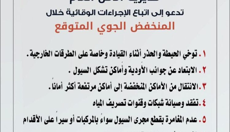 ندعو الجميع لمتابعة وسائل الاعلام واتباع كل ما يصدر من ارشادات ونصائح وتحذيرات