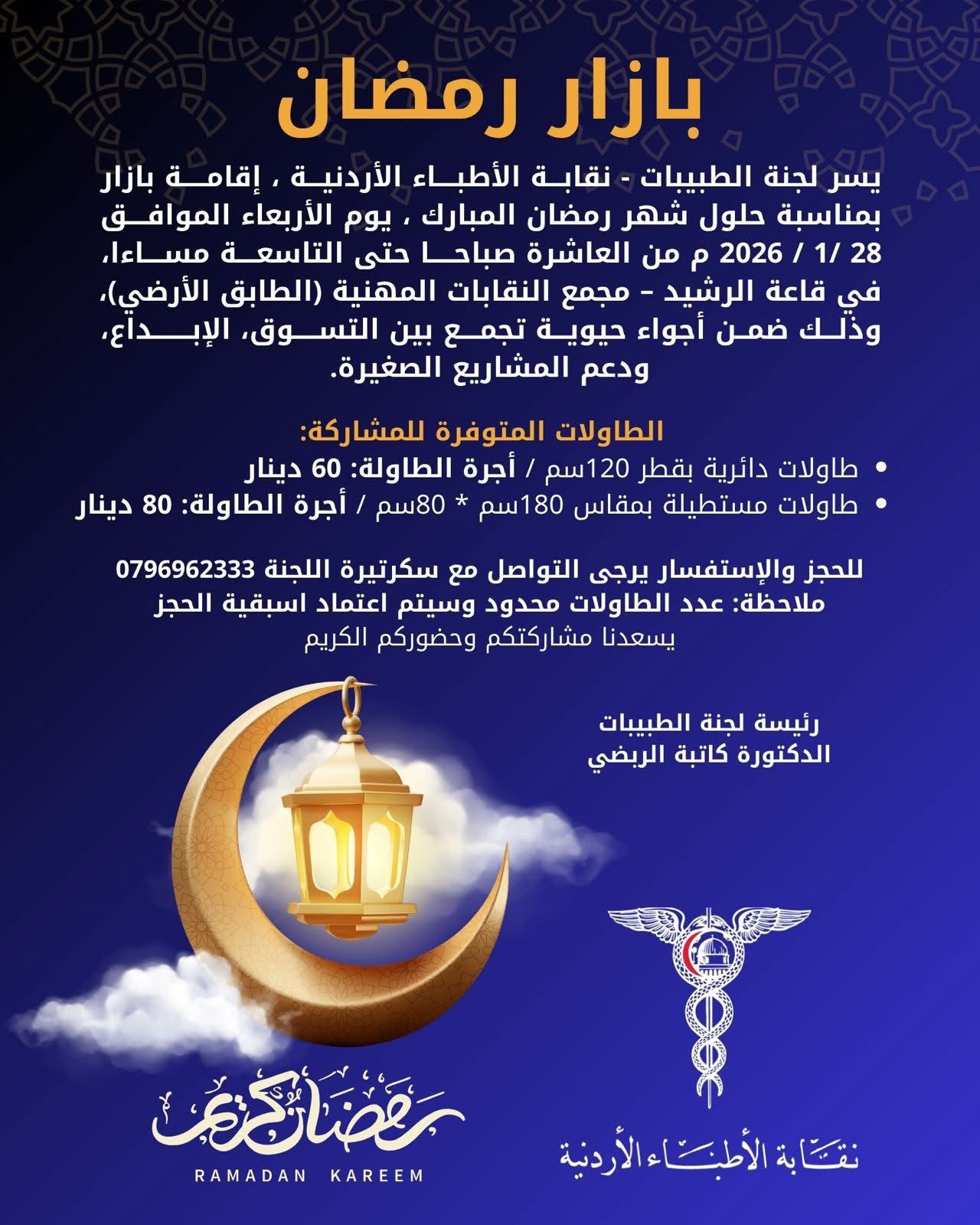 تُنظّم لجنة الطبيبات في نقابة الأطباء الأردنية بازار رمضان، بمناسبة قرب حلول شهر رمضان المبارك، وذلك يوم الأربعاء الموافق 28 كانون الثاني 2026، من الساعة العاشرة صباحاً وحتى التاسعة مساءً، في قاعة الرشيد – مجمع النقابات المهنية (الطابق الأرضي).