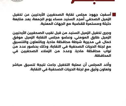 أسفرت جهود مجلس نقابة الصحفيين الأردنيين عن تكفيل الزميل الصحفي أمجد السنيد مساء يوم الجمعة، بعد متابعة حثيثة ومستمرة للقضية مع الجهات المعنية.