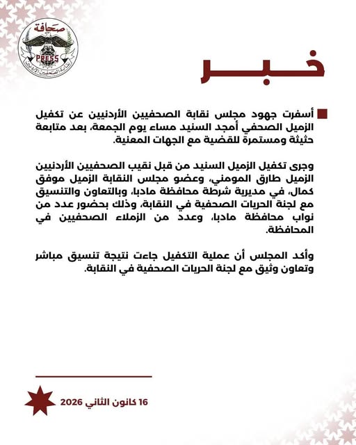 وأكد مجلس النقابة أن عملية التكفيل جاءت نتيجة تنسيق مباشر وتعاون وثيق مع لجنة الحريات الصحفية، في إطار دور النقابة في حماية الصحفيين والدفاع عن حقوقهم، وضمان ممارستهم لعملهم المهني ضمن الأطر التي يكفلها الدستور والقانون.