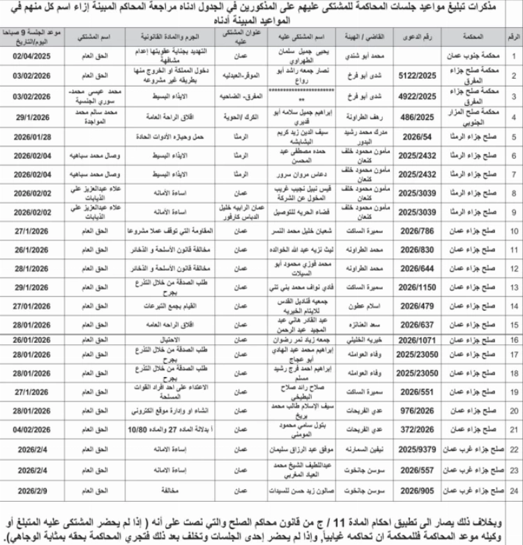 صدرت اليوم الاثنين مذكرات تبليغ مواعيد جلسات المحاكمة لمشتكى عليهم ولمتهمين ولأظناء وقرارات إمهال.