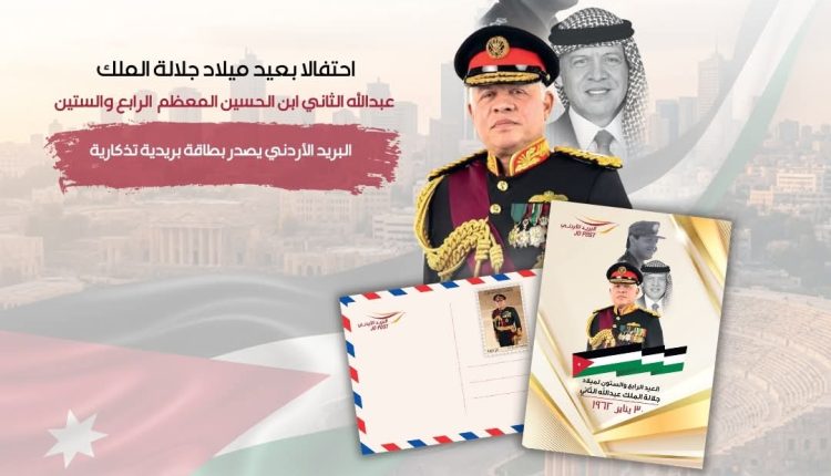 أعلن البريد الأردني عن طرح بطاقة بريدية تذكارية خاصة بمناسبة عيد ميلاد جلالة الملك عبدالله الثاني ابن الحسين المعظم الرابع والستين ، وذلك اعتبارا من صباح يوم الخميس الموافق 29 كانون الثاني 2026، في مبنى شركة البريد الأردني، وبكميات محدودة، وبقيمة (1.40) دينار للبطاقة الواحدة.